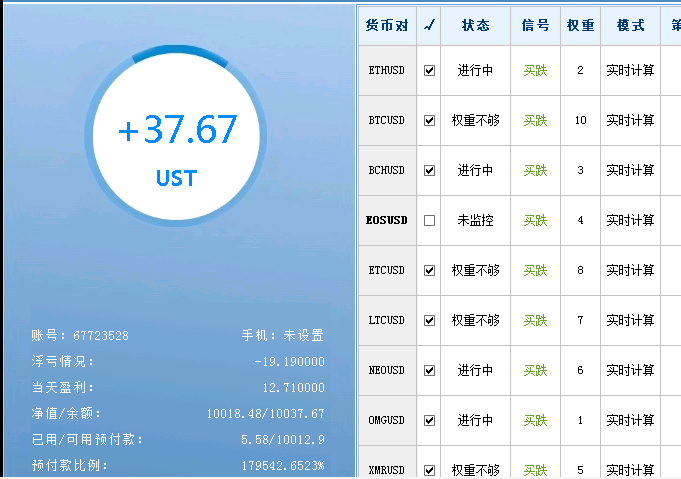 根据每个品种的买卖深度对比、搜索系数和K线震荡指数,实时云计算得出每个策略组的买入条件和买入间隔!当报价在若干个时间周期内,连续大幅下跌时,自动暂停买入或扩大买入间隔!